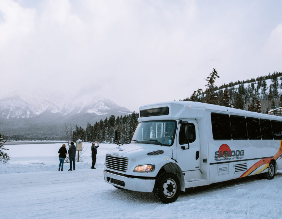When you book a trip through Edmonton-Jasper that includes a shuttle service, it will be operated by SunDog Transportation and Tours. You’ll be taken from Edmonton to Jasper in a comfortable coach in around 4.5 hours. Check the current schedule on the SunDog Transportation and Tours website. Good to know: on board the shuttle bus, you’re allowed to bring one piece of checked luggage and one piece of hand luggage. Are you bringing your own skis or snowboard? Then you can take them on board free of charge as well. Make sure you arrive at the pick-up location at least 15 minutes in advance.