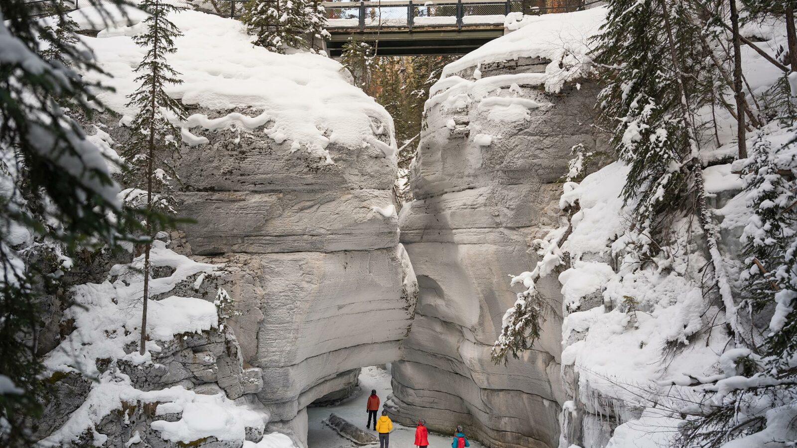 The Maligne Valley & Pleckaitis Canyon Icewalk is an adventure activity that will show you the most beautiful places in Jasper National Park. This tour takes you into the heart of the Maligne Valley, with stops at scenic viewpoints such as Medicine Lake. Your guide will talk about the ecology of forest fires and how the landscape recovers. The highlight is an ice walk through the hidden Pleckaitis Canyon, a pristine gorge with towering rock walls. Due to the July 2024 forest fires, Maligne Canyon will not be accessible in the winter of 2025, but this tour is the perfect alternative to that.